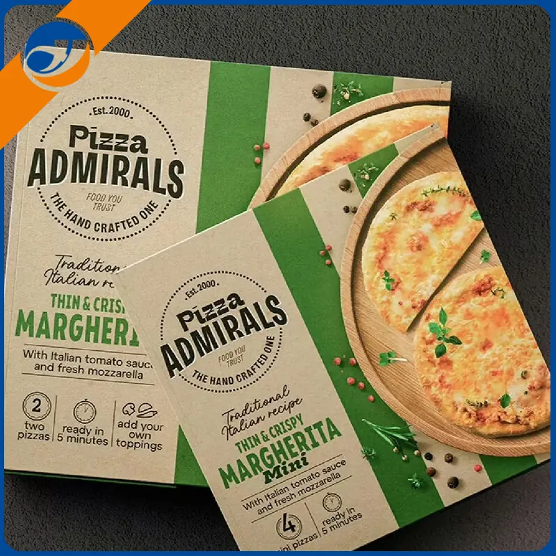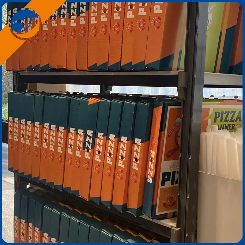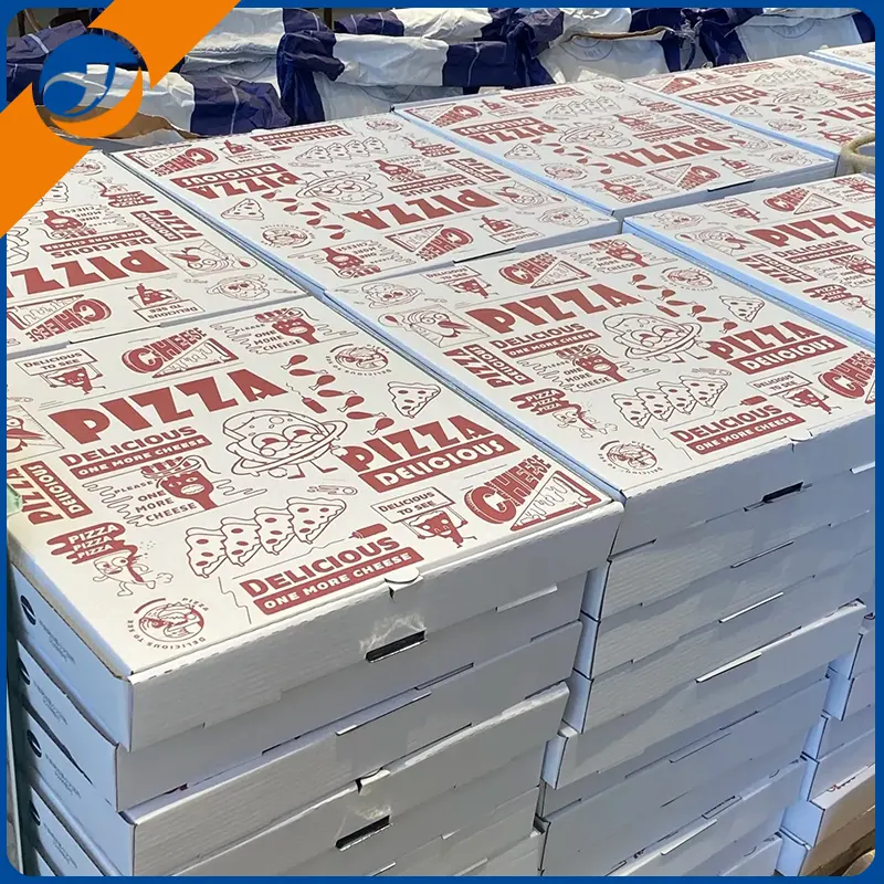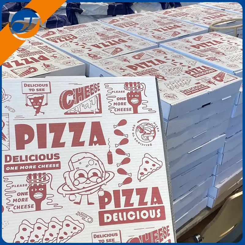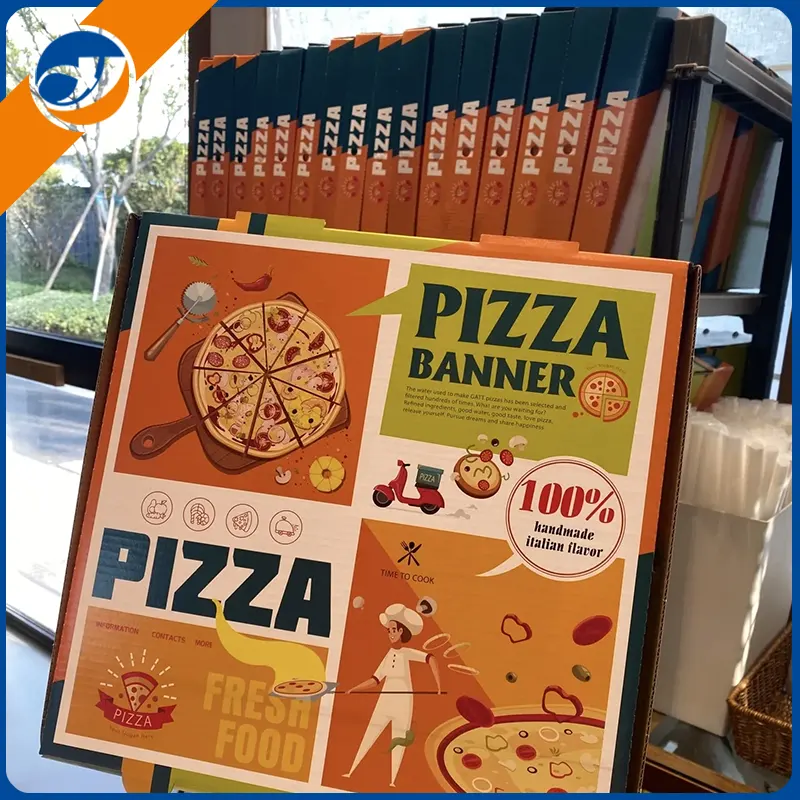 Caja de pizza exquisitaEl proceso de impresión personalizado admite la restauración de alta precisión del logotipo de marca, ilustraciones o patrones de temas, y mejora el reconocimiento de la marca.