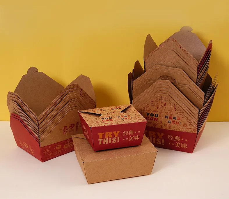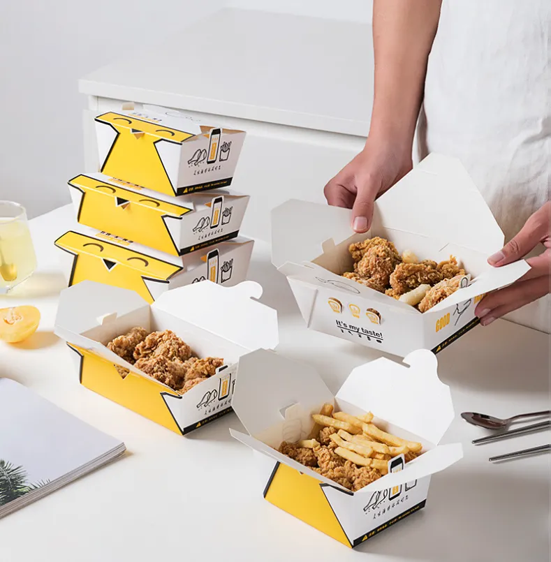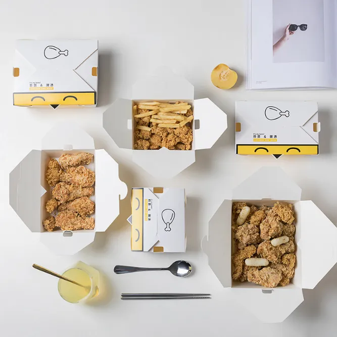 La caja de pollo frito es un tipo de envase de papel para pollo frito diseñado específicamente para la industria de comida rápida. La caja de pollo frito está hecha de cartón de calidad alimentaria resistente a altas temperaturas y aceites, impermeable y a prueba de fugas, apto para frío y calor y fácil de empaquetar. Es una práctica caja para pollo frito con buen sellado y aislamiento, que puede mantener eficazmente la frescura y temperatura del pollo frito. La caja de pollo frito producida por la fábrica Zemeijia admite impresión personalizada y es adecuada para escenas de comida para llevar, catering y fiestas.