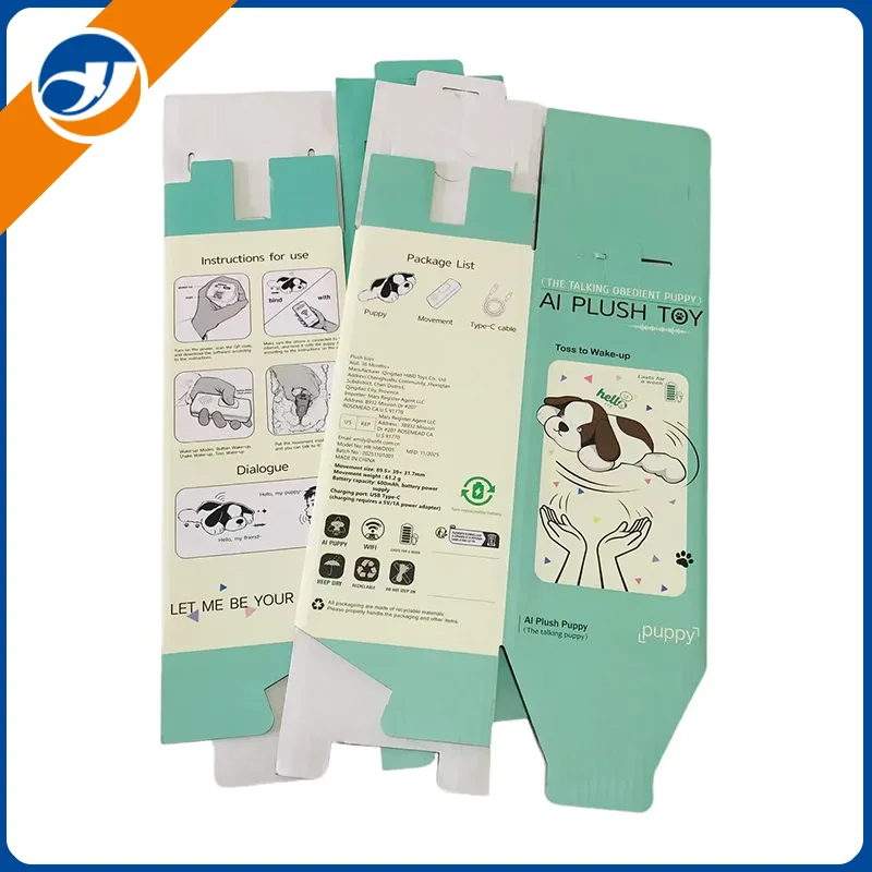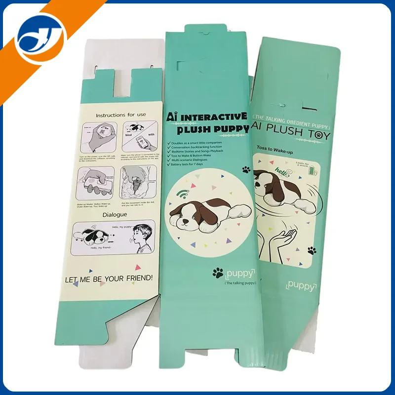 Esta es una caja de embalaje corrugado personalizada diseñada específicamente para el cachorro de peluche. Diseñada tanto para proteger como para contar historias de marca, esta caja troquelada e impresa a todo color combina un diseño funcional con materiales ecológicos, lo que la convierte en la solución de embalaje ideal para juguetes de peluche. Elaborado con cartón corrugado reciclable, incluye instrucciones de uso claras, una lista detallada de paquetes y mensajes de marca para mejorar la experiencia de desempaquetado y al mismo tiempo se alinea con prácticas sustentables.